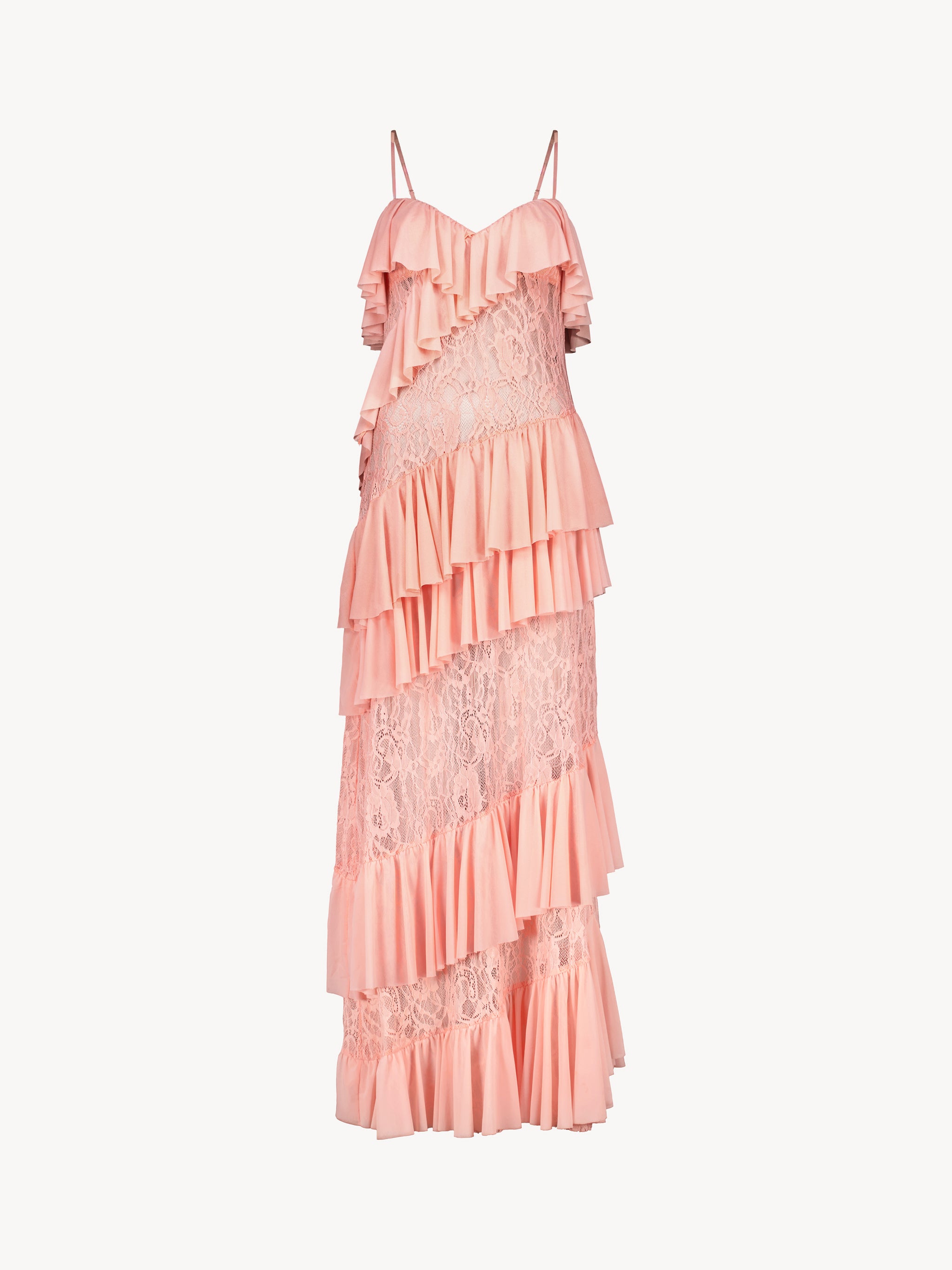 Tiered ruffles cascade like evening waves, airy and romantic.