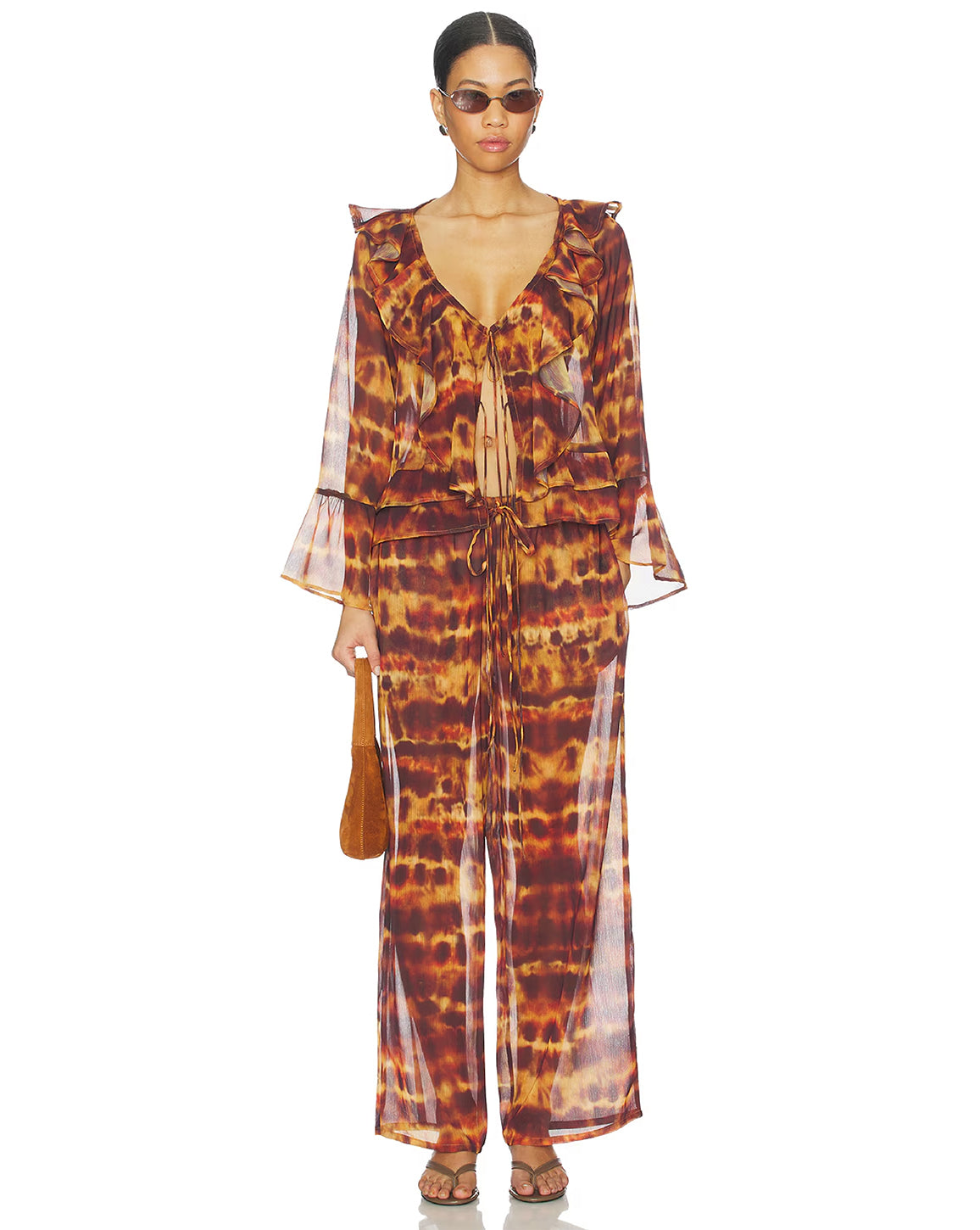 Earthy tones and body-skimming lines create a sensual, sunset-inspired top.