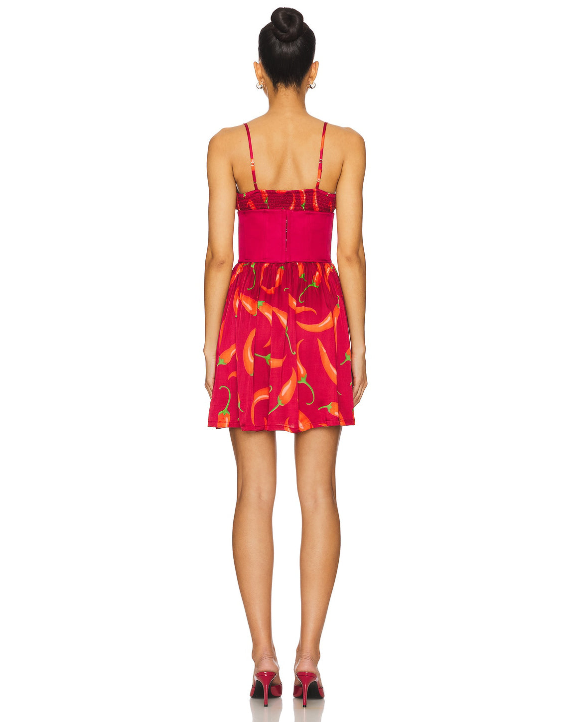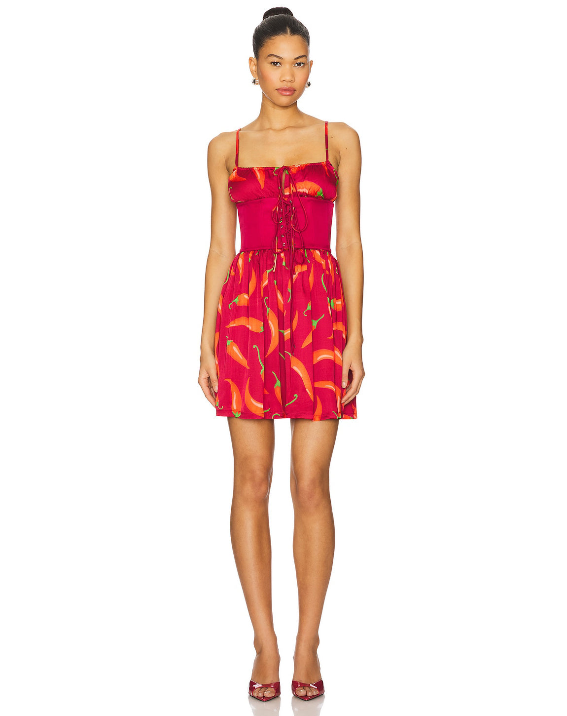 The Slip Mini Corset dress commands attention in fiery red, adorned with spicy chili pepper motifs and a sleek corset that sculpts the silhouette. The perfect blend of heat and allure.